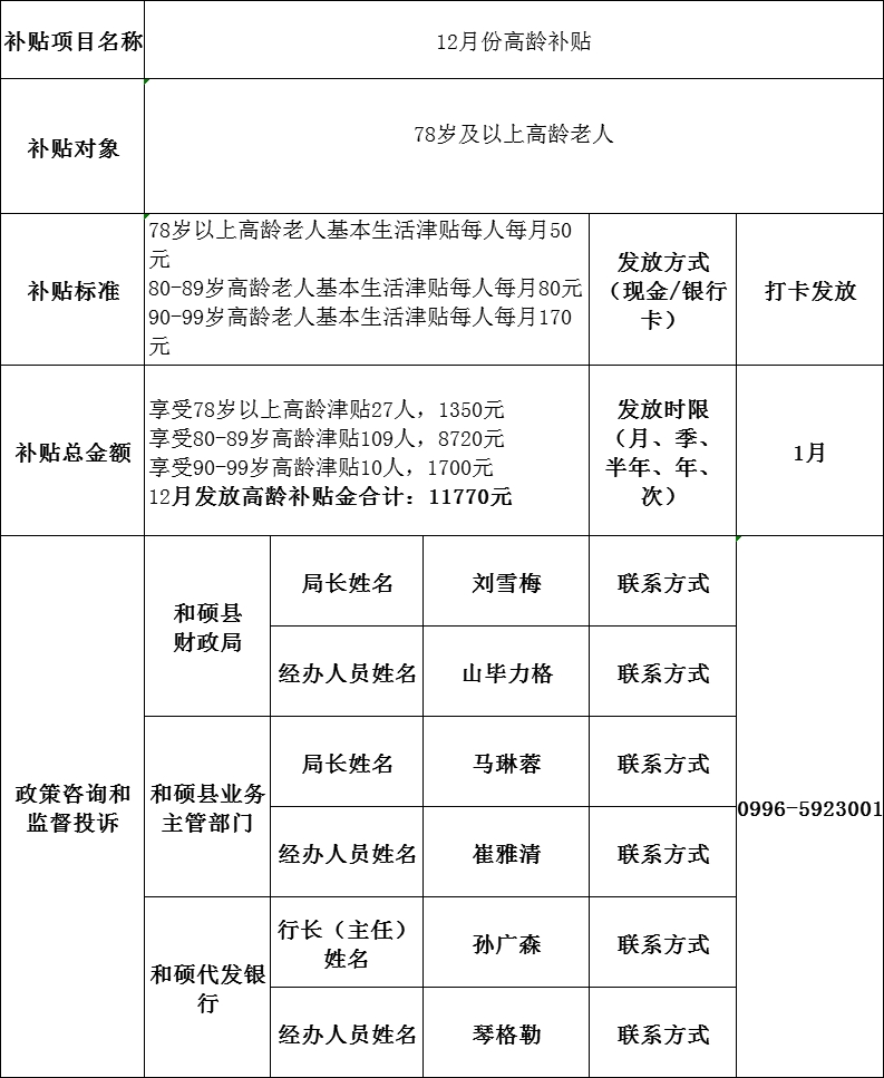 和硕县新塔热2025年12月乡高龄补贴公示表
