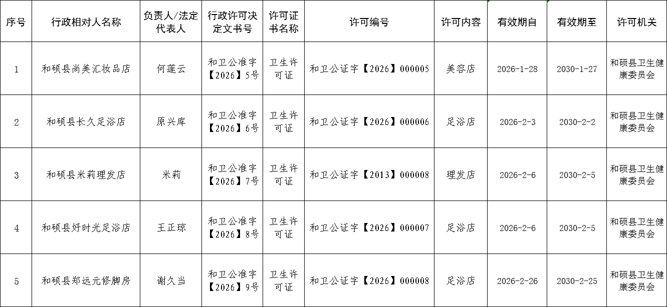 和硕县卫生健康委员会行政许可公示信息表(2026年2月)
