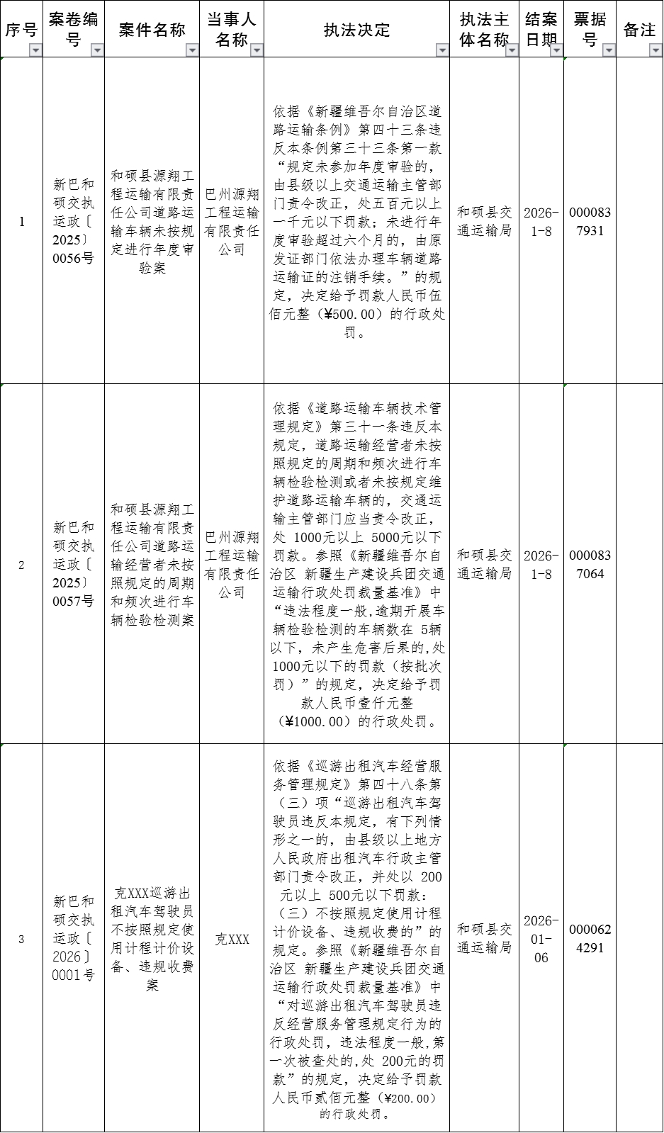 巴州交通运输行政处罚案卷登记台账(和硕县交通运输局)(2026年1月第二周)