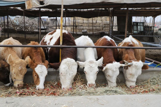 和硕县新塔热乡新塔热村养殖户邓尚春说:“我们主要是喂了些麦秸秆、苞谷秸秆,还有一些苞谷面,就是调理肠胃的饲料。这样喂出来的牛比较健康,那牛长势也好,抵抗力也强,冬天不怕冻,也不生病。身体健康了,收成也就好了。”