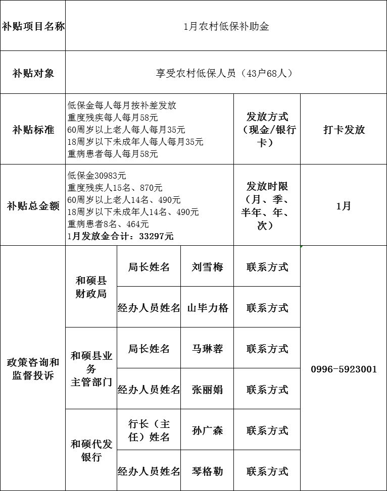 和硕县新塔热乡1月农村低保补贴公示表
