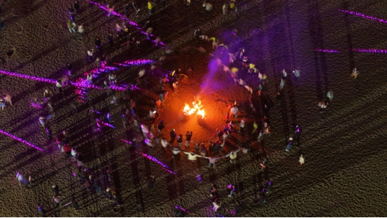 夜幕完全降临后,金沙滩迎来更热烈的狂欢时刻。海浪剧场灯火璀璨,湖岸长廊波光摇曳,鱼跃广场人潮如织。随着篝火冲天而起,跃动的火苗映红了人们的笑脸。来自五湖四海的游客手挽手,围绕篝火载歌载舞,欢声笑语与欢快的节奏交织,将整片沙滩化作欢乐的海洋。