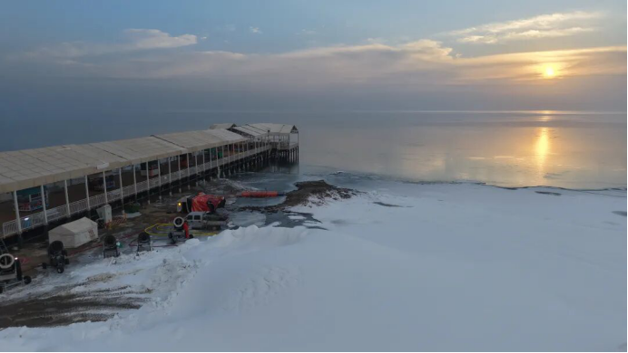 记者在现场看到,多台大型造雪机正持续向空中喷射雪雾,洁白的雪粒随风飘落,在沙滩上逐渐堆积。工作人员穿梭其间,对造雪设备进行巡检调试,同时着手平整雪道、规划功能区域,根据设计方案对滑道坡度、宽度进行精细修整,确保雪滑梯、冰滑道等项目的安全性与趣味性,一派繁忙筹备景象。