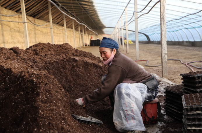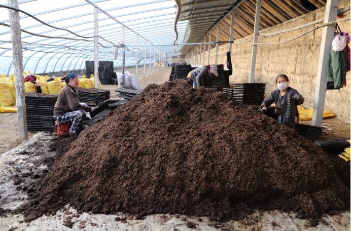 和硕县清源农业发展有限公司种植户杨泽军说:“今年我承包了九座大棚,其中计划培育八座棚的辣椒苗,一个棚的西瓜苗,从前天开始装营养土,已经装了两个棚了,还剩七个棚。装完营养土以后,前期准备工作就基本做完了,大概1月18号就可以点种育苗了。”