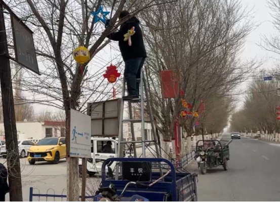 近日,和硕县塔哈其镇各村、社区两委干部与群众齐上阵,共同悬挂灯笼、装点灯饰。一场火热的新春亮化工程在全镇各村社区展开,千余盏崭新夜灯如点点繁星,点亮了乡村的夜晚,街头巷尾悄然焕新颜,拉满春节“氛围感”,更温暖了各族群众的心田。