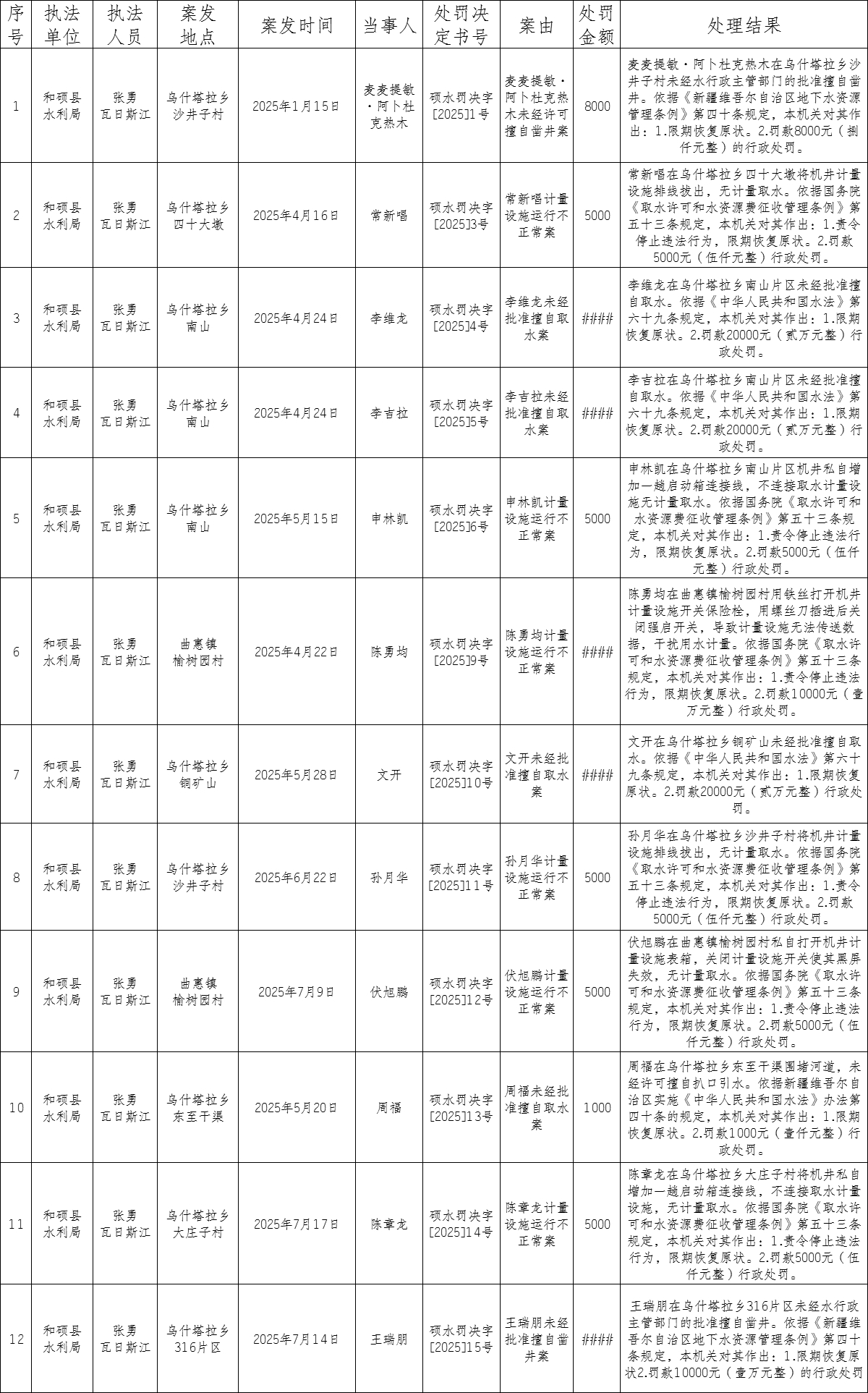 和硕县水利局2025年行政处罚信息公示